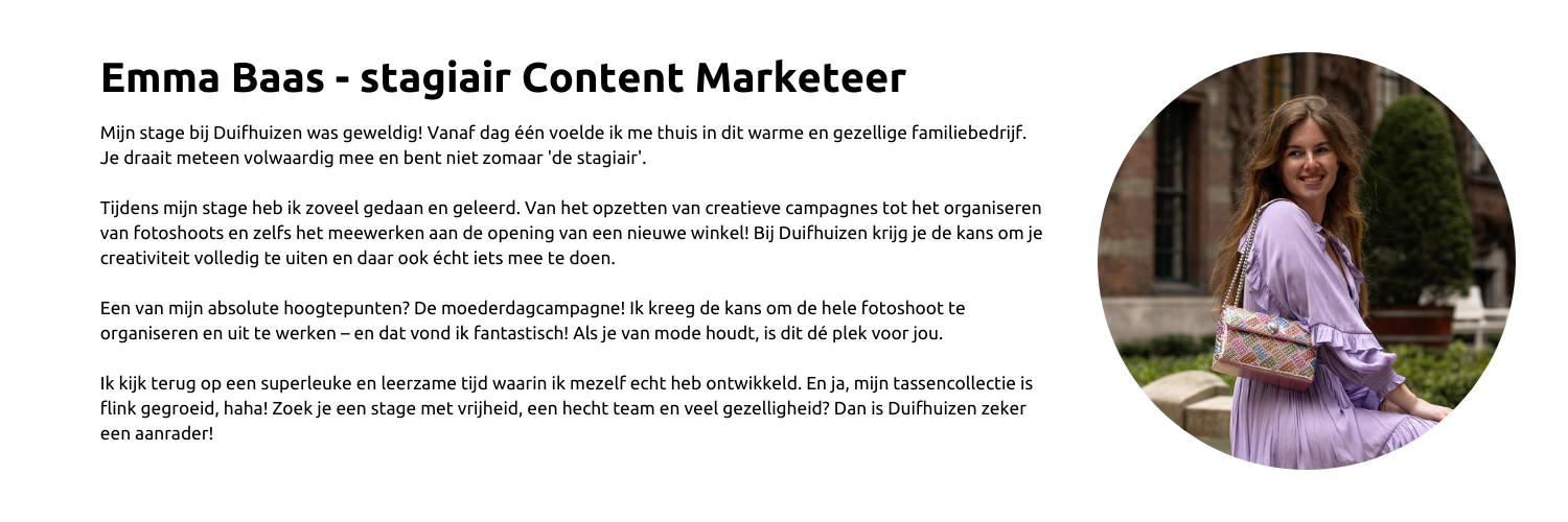Voor BOL-stages in de logistiek (Oud-Beijerland), op het hoofdkantoor (Oud-Beijerland) of in één van onze winkels, kun je een open sollicitatie sturen naar sollicitatie@duifhuizen.nl.